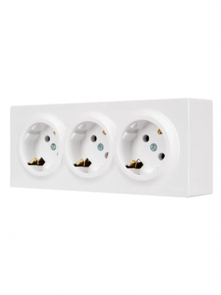 Розетка тройная с/з закрытый корпус ПБТ белый LETO-LEZARD. Корпус выполнен из негорючего поликарбоната (РС). Внутренний механизм выполнены из негорючего поликарбоната, выдерживающий 850°С. Токопроводящие элементы выполнены из MS70 (70% меди,30% цинка).