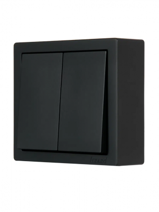 Выключатель двойной чёрный бархат LETO-LEZARD. Корпус выполнен из негорючего поликарбоната (РС). Внутренний механизм выполнены из негорючего поликарбоната, выдерживающий 850°С. Токопроводящие элементы выполнены из MS70 (70% меди,30% цинка).
