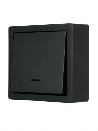 Выключатель с подсветкой чёрный бархат LETO-LEZARD. Корпус выполнен из негорючего поликарбоната (РС). Внутренний механизм выполнены из негорючего поликарбоната, выдерживающий 850°С. Токопроводящие элементы выполнены из MS70 (70% меди,30% цинка).