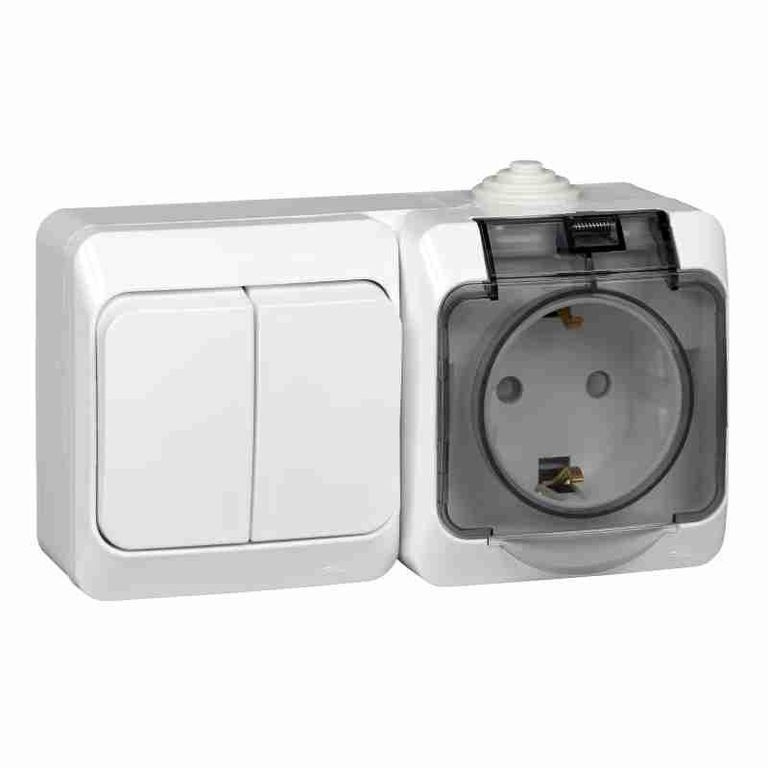 Блок Systeme Electric (ранее Schneider Electric) ЭТЮД (белый, открытой установки) предназначен для применения в сетях до 250В, состоит из розетки на 16А, со шторками, без заземления и двухклавишного выключателя на 10А. Две клавиши позволяют управлять двумя источниками света с одной точки. Он удобен в применении и отлично подходит для ванной комнаты (IP44). Сделано в России.