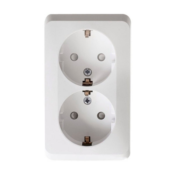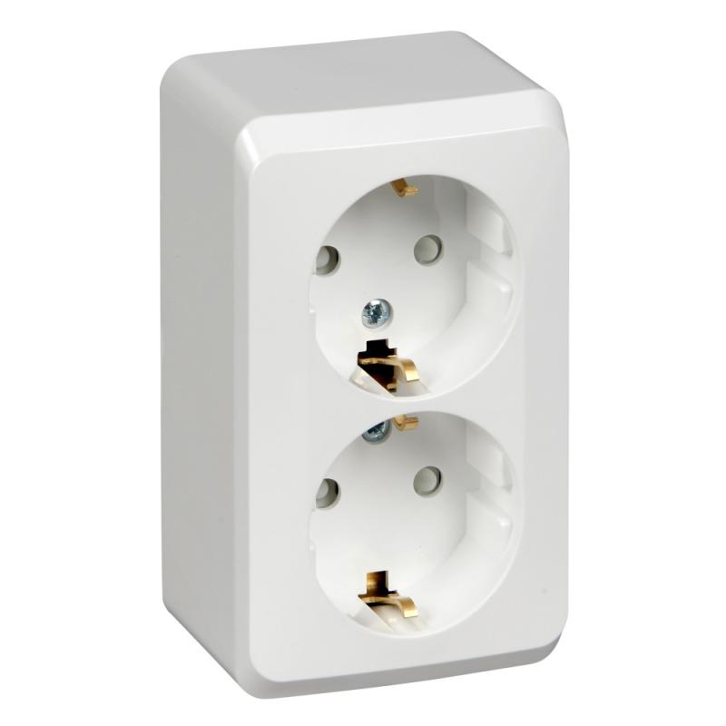 Розетка Systeme Electric (ранее Schneider Electric) ЭТЮД (белый, открытой установки) двухместная с заземлением и шторками предназначена для применения в сетях до 250В, на ток до 16А. Двухместная розетка позволяет подключить два устройства в одном месте. Шторки и заземление обеспечивают дополнительную безопасность при косвенных прикосновениях. Сделано в России.