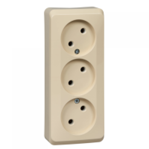 Розетка Systeme Electric (ранее Schneider Electric) ЭТЮД (кремовый, открытой установки) трёхместная, без шторок и заземления предназначена для применения в сетях до 250В, на ток до 16А. Трёхместная розетка позволяет подключить три устройства в одном месте. Она проста в установке и удобна в применении. Сделано в России.