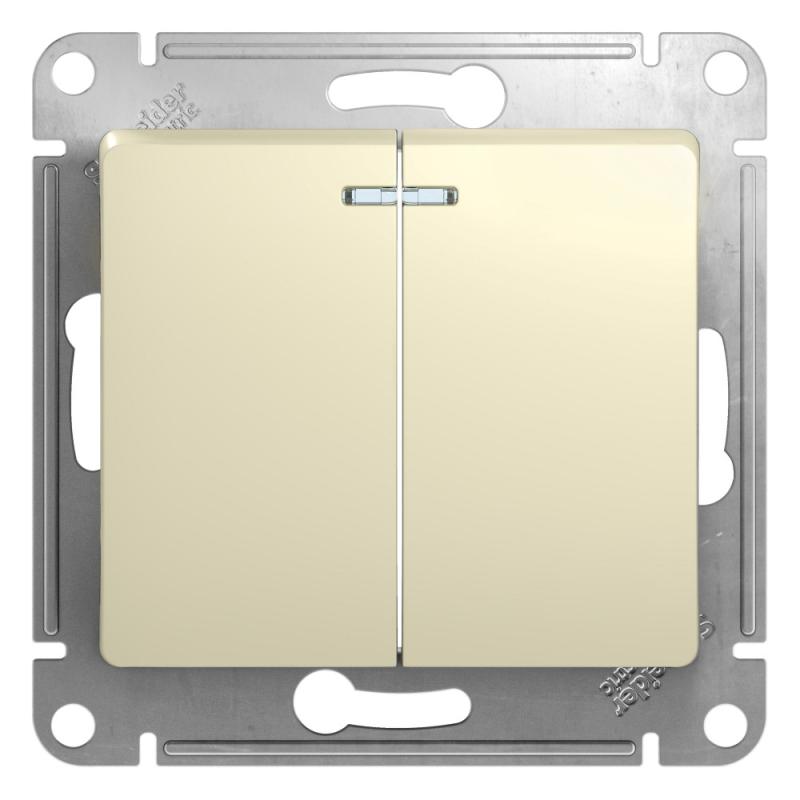 Механизм Systeme Electric (ранее Schneider Electric) серии Glossa (цвет бежевый) выключателя 2-клавишного c подсветкой подходит для сетей 250 В, на ток 10 А. - Благодаря современной светодиодной подсветке зеленого цвета изделие легко найти в темноте. - Двухклавишный выключатель позволяет управлять двумя источниками света с одной точки. - Выполнен из материала PС+ASA, стойкого к УФ-излучению и появлению царапин. - Эргономичные клеммы расположены в два ряда: сверху и снизу.