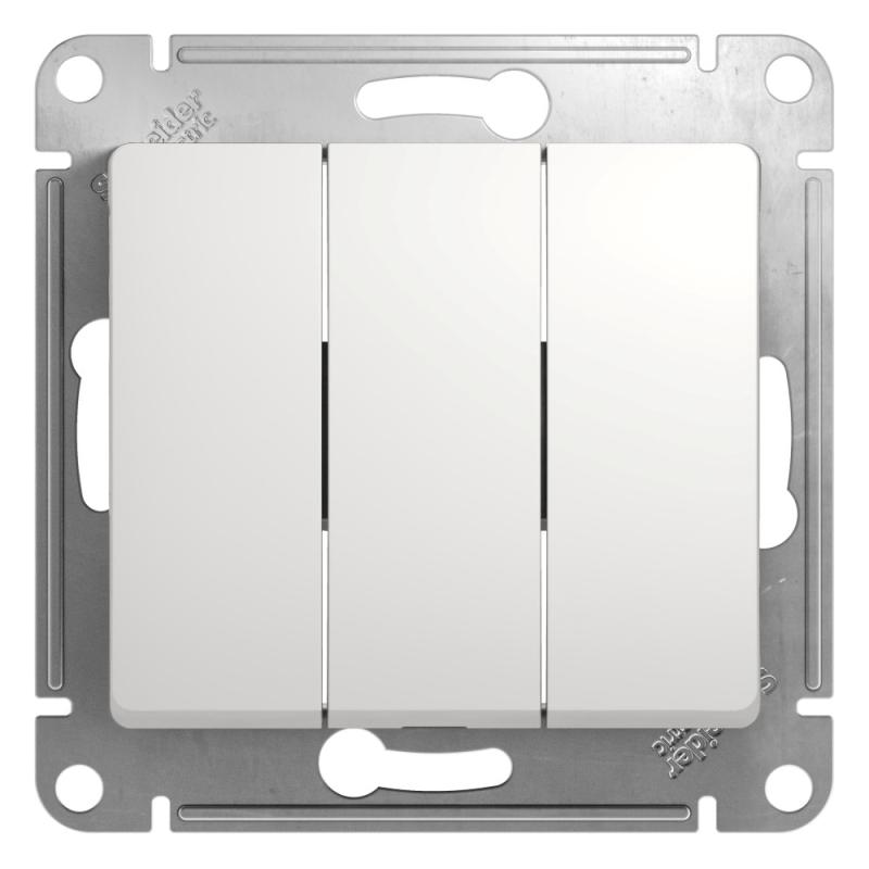 Механизм Systeme Electric (ранее Schneider Electric) серии Glossa (цвет белый) выключателя 3-клавишного подходит для сетей 250 В, на ток 10 А. - Трёхклавишный выключатель позволяет управлять тремя источниками света из одной точки. - Выполнен из материала PС+ASA, стойкого к УФ-излучению и появлению царапин. - Эргономичные клеммы расположены в два ряда: сверху и снизу.