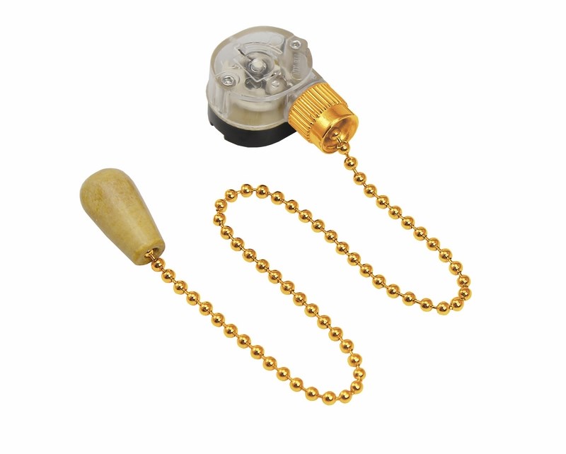 Выключатель для настенного светильника с хромированной цепочкой и деревянным наконечником.