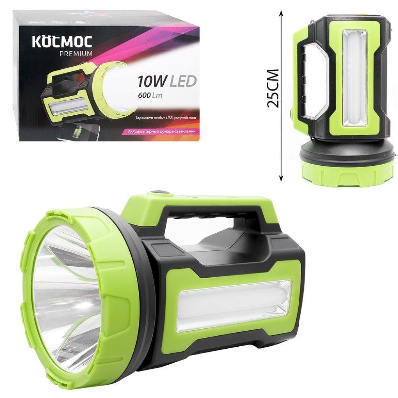 Фонарь аккум KOSMOS PREMIUM 10W LED, бок.пан. 4Вт, 3 режраб, регулировка яркости, з/у220/12в usb вых