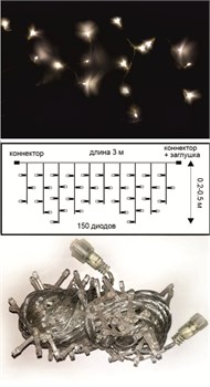 Наращиваемая светодиодная гирлянда состоит из базовой секции, которая может являться самостоятельной гирляндой, и дополнительных секций, которые можно подключить к базовой секции, чтобы удлинить гирлянду. Базовая секция имеет сетевой провод с вилкой для подключения к сети 220В и контроллер с одной кнопкой для переключения 8 режимов.