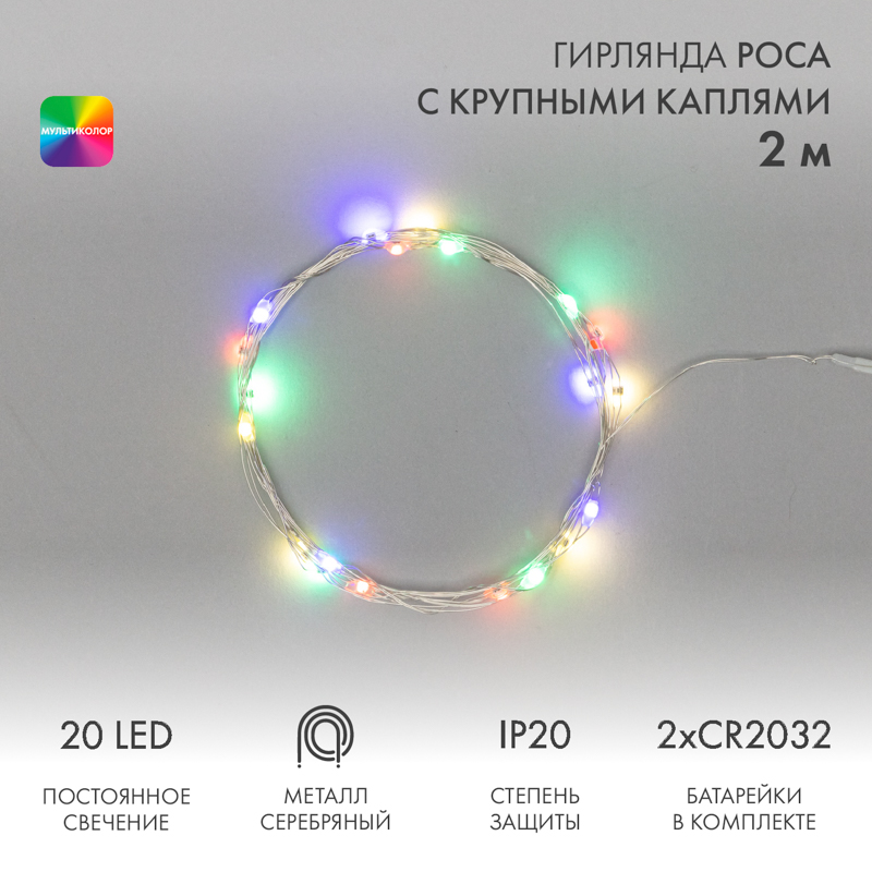 Отличительной особенностью данной гирлянды являются более крупные диоды. В качестве питания у данной модели гирлянды выступают батарейки 2хСR2032, которые идут в комплекте.