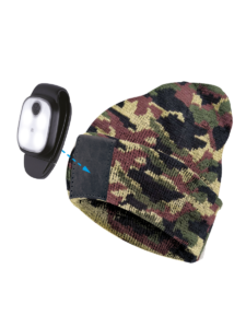 Шапка со съёмным LED-фонариком. Цвет — камуфляж. Фонарик работает до 5 часов без подзарядки, и легко снимается с шапки: благодаря клипсе его можно закрепить на велосипед, собачий ошейник (для этого есть режим красного мигания) или на другую одежду.