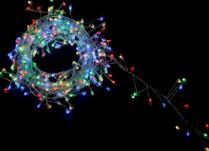 Светодиодная гирлянда "Разноцветные нити" -10 метров. 100 мельчайших светодиодов в виде капель расположенные на медной тонкой проволоке. Работает от 220В. Вилка с трансформатором с 220В до 5В делает гирлянду безопасной в использовании.