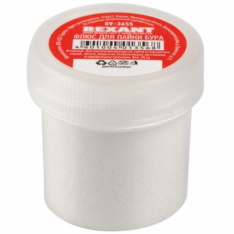 Флюс для пайки  БУРА  20 г REXANT предназначен для удаления оксидов с поверхности под пайку, улучшения растекания жидкого припоя при пайке углеродистых сталей, чугуна, меди и её сплавов медно-цинковыми и серебряными припоями. Представляет собой порошок белого, светло-серого или подобных оттенков цвета, и позволяет осуществлять сплавление обычных металлов с благородными посредствам газопламенного нагрева.