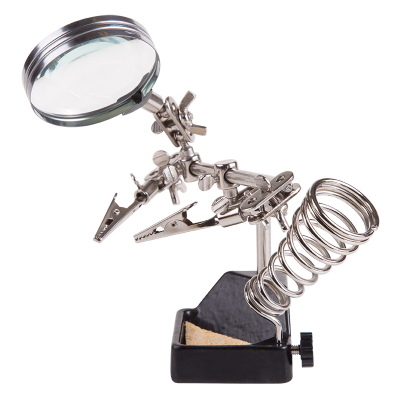 Инструмент состоит из чугунного основания (тяжелая подставка с нишей для губки, мелких деталей или припоя), шарнирного соединения с зажимами типа «крокодил» (подвижных во всех плоскостях) с никелевым покрытием, лупы с 2.5-кратным увеличением (возможность регулировки положения, диаметр линзы 60 мм) и спиралевидной подставки под паяльник.