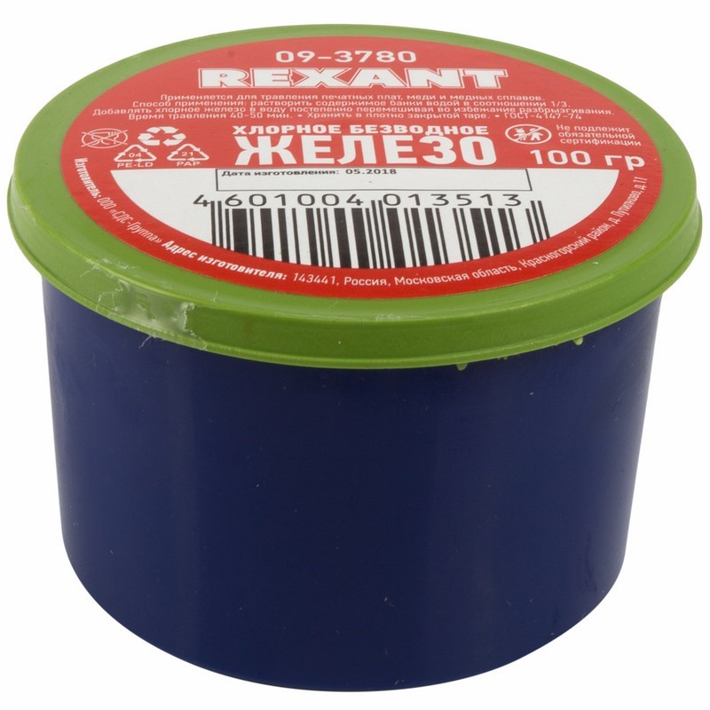 Хлорное железо 100 г REXANT предназначено для травления печатных плат, меди и ее сплавов в электронной промышленности и приборостроении водным раствором.
